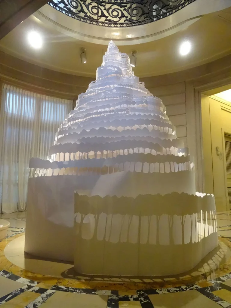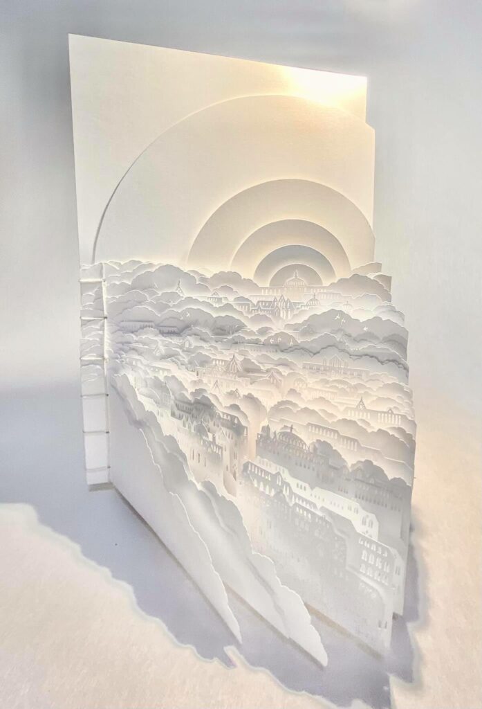 Le sue abili forbici recidono e intagliano i fogli, rigorosamente bianchi, che si configurano via via a guisa di reti, o ragnatele, o ricami, o radiografie di elementi, alberi, paesaggi immaginari, città ideali, ondulazioni, increspature, vortici soavi, impronte e fluttuazioni… un artigianato albino su cui luci – strategicamente posizionate – e ombre ne amplificano ritmi e intensità. Una specie di fase delle fasi capace di associare e far lievitare il sogno… quello di un mondo in cui gli esseri umani e la natura convivano pacificamente. Non a caso, le sue sculture si richiamano anche ai concetti dello Yin e Yang, le due potenze inverse e complementari che si integrano e si completano vicendevolmente, determinando l’armonia dell’universo. Lo Yin è abbinato a ciò che è passivo, indifferente, vacuo, mentre lo Yang è abbinato a ciò che è attivo, vivido, pervaso.