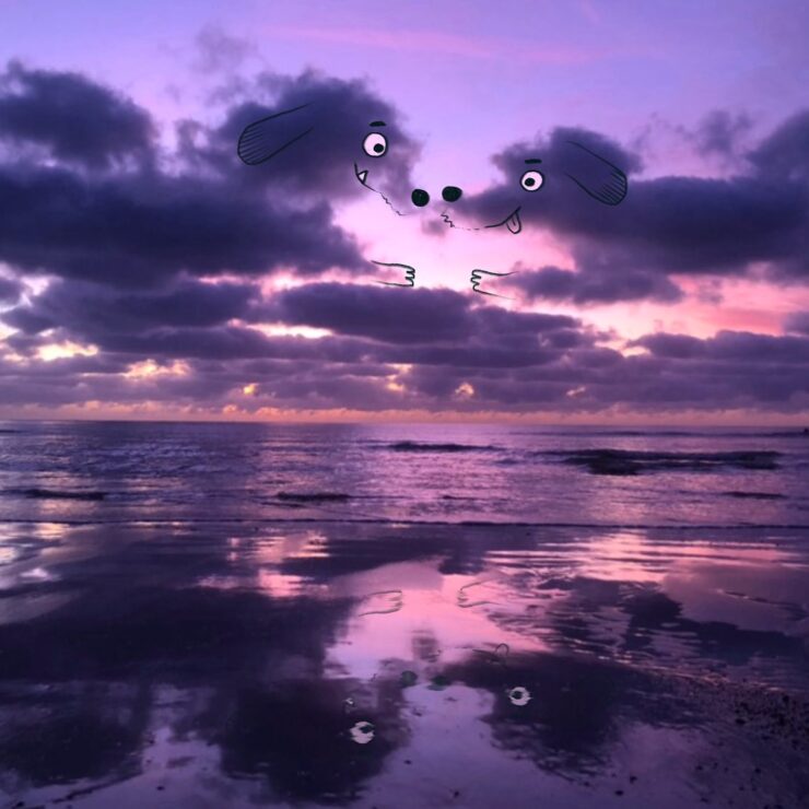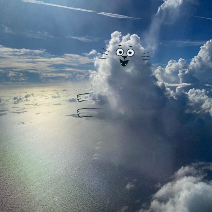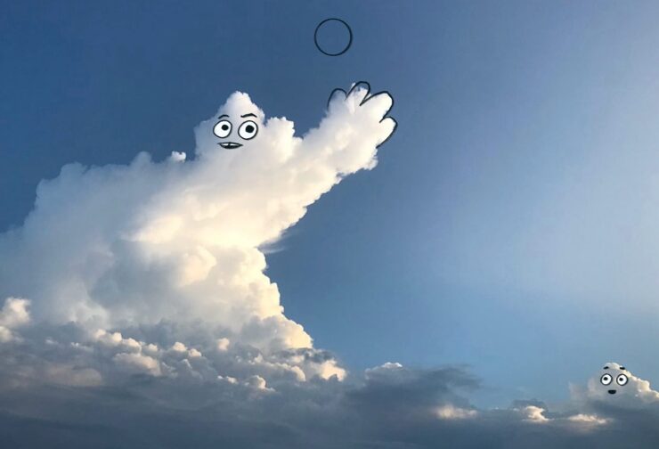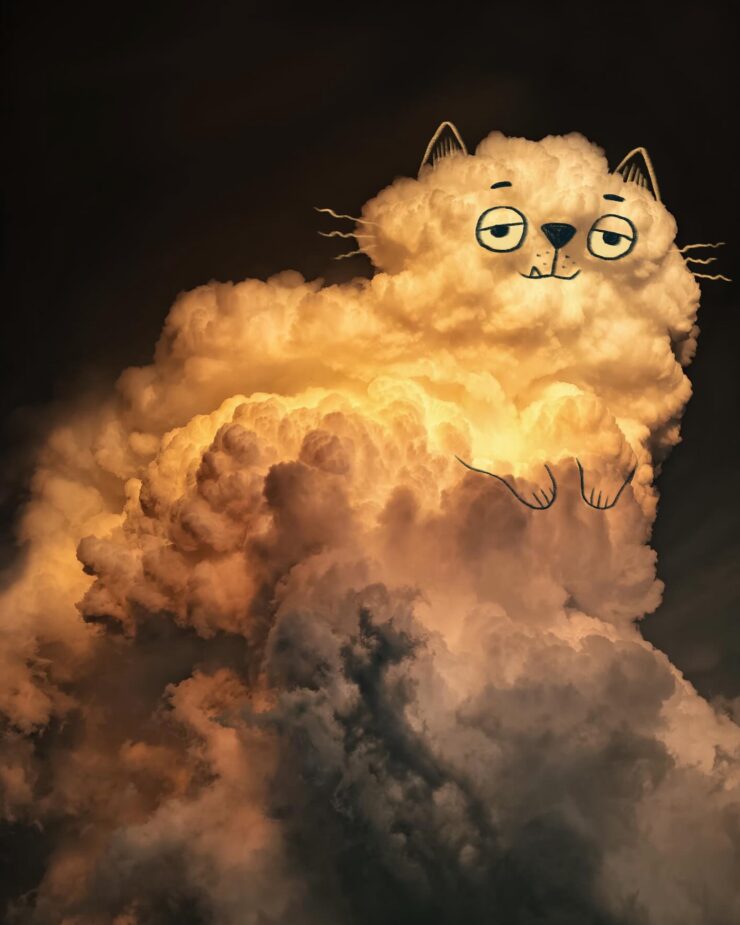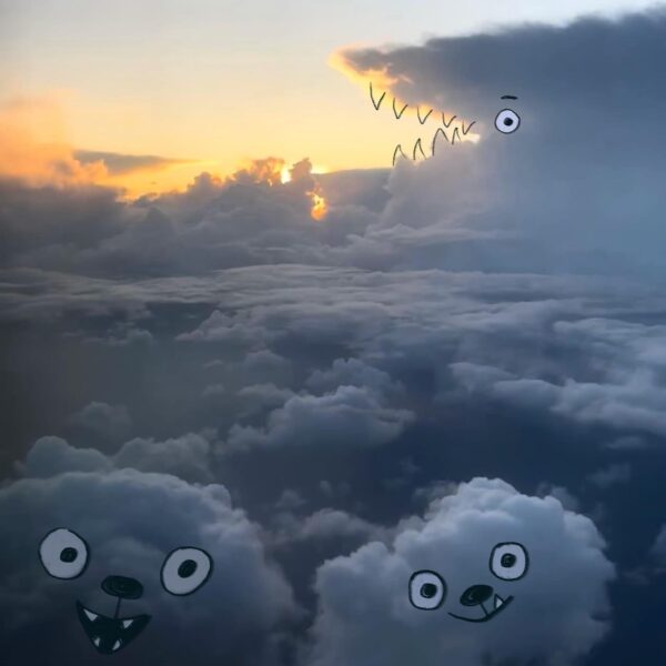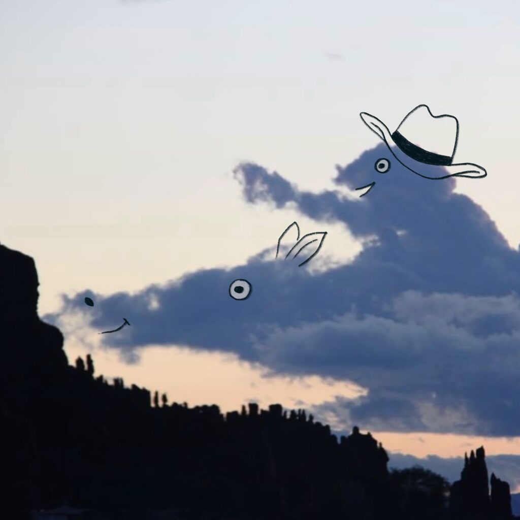 Nell’estate del 2020, durante le misure di confinamento per la pandemia di Covid-19, Chris, tra un’illustrazione e l’altra, una storia per l’infanzia e l’altra, si tratteneva parecchie ore in giardino in compagnia dei figlioletti e della moglie Cliona O’Flahertyalla, fotografa di professione. In tanta pace forzata ma intrisa d’inaspettata intimità familiare, la volta celeste e la sua osservazione di giorno e di notte, divennero complici di un’avventura singolare: con scrupolosa e gioiosa frequenza, egli iniziò a sfogliare con sguardo pensante l’immenso album di Cirri, Nembi, Strati… l’intero repertorio delle nubi insomma, rintracciando in ognuna nuova vita e nuove logiche che, per qualche segreto, abitano l’altrove. Da lì, l’idea di fotografarle e di intervenire graficamente sulle foto stesse per caratterizzare ciò che lui già aveva ravvisato: creature degli abissi e creature dell’aria, mostri benevoli, ciclopici faccioni, spettri gioviali che anziché incutere timore invitano al sorriso, e soprattutto simpatici animali, dai più domestici ai più selvatici.