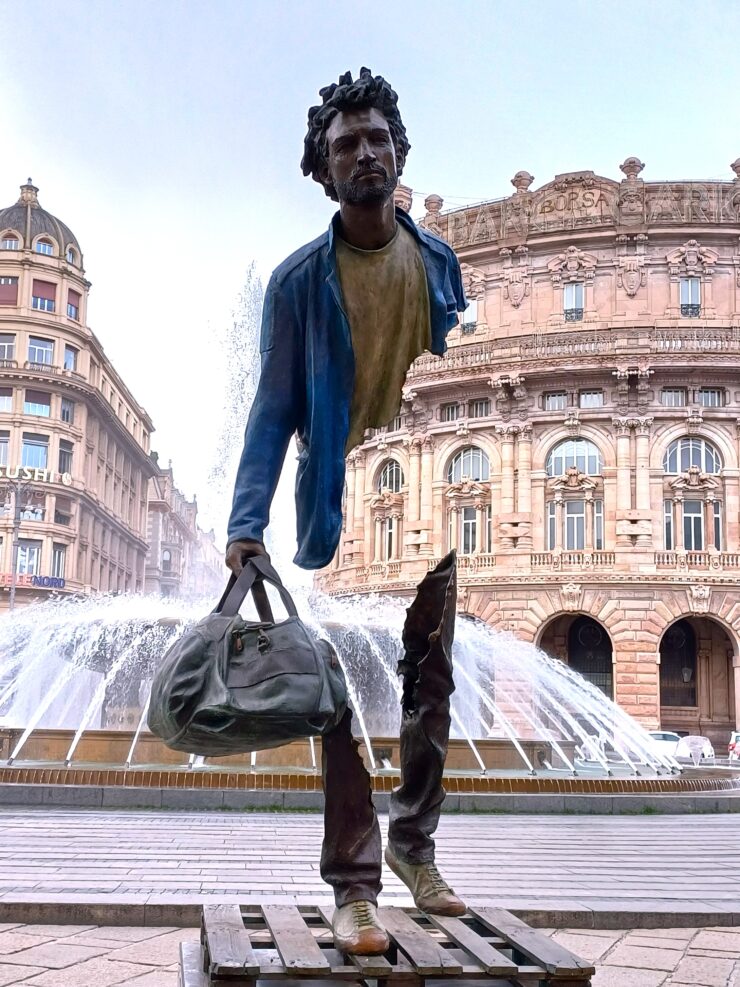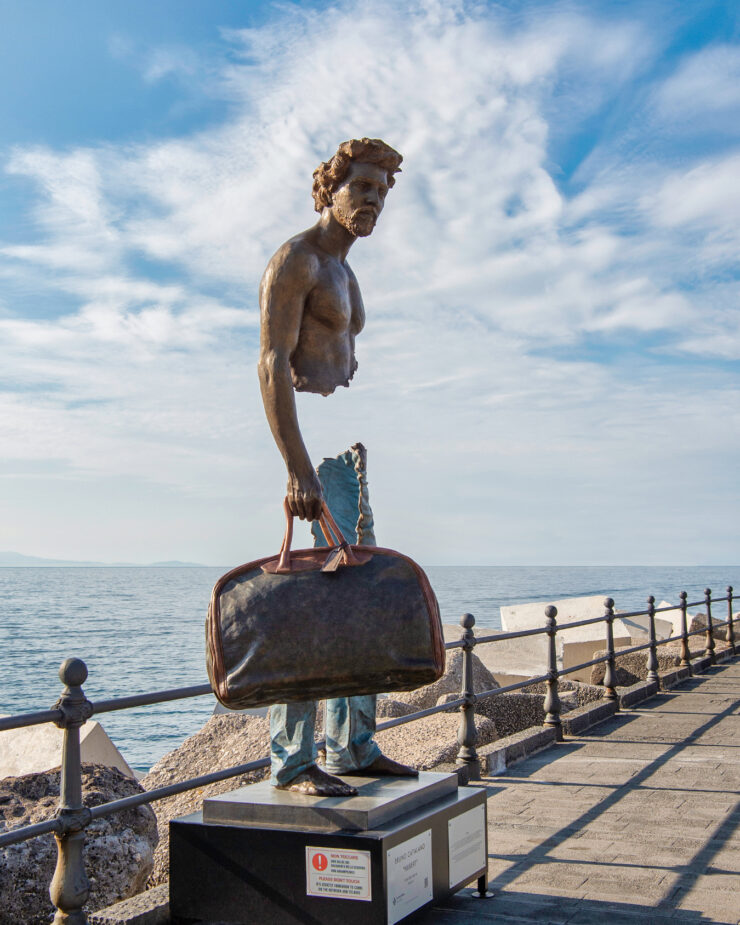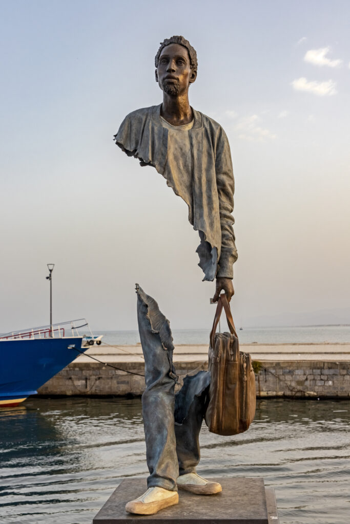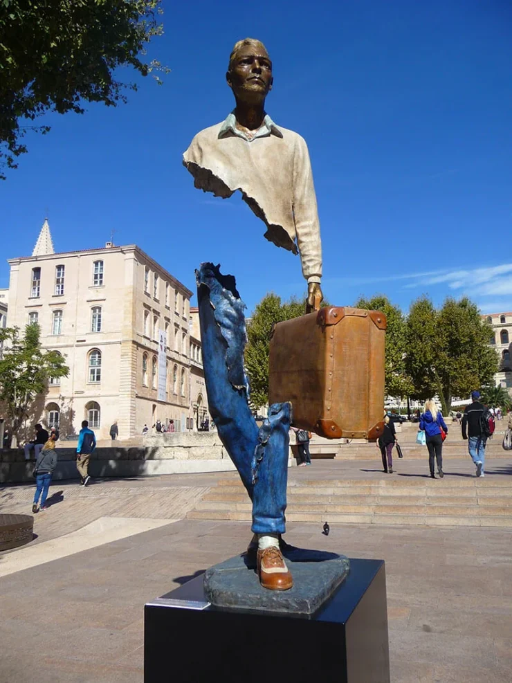 Figure vulnerabili e potenti ormai disseminate per il globo, figure incomplete, slabbrate, scavate, corrose. Il busto galleggia sopra le gambe. Due brani di fisicità in un’ipotesi di intero: è la valigia il trait d’union, l’innesto tra la porzione pensante e la porzione viandante. Valigia (o borsone, o sacca, o fagotto, comunque unica risorsa) che custodisce tutto, radici e prospettive, centri di forza. “È come se il corpo si svuotasse per fare spazio alla storia che trasporta. E quella storia è sempre più grande del corpo stesso”. |