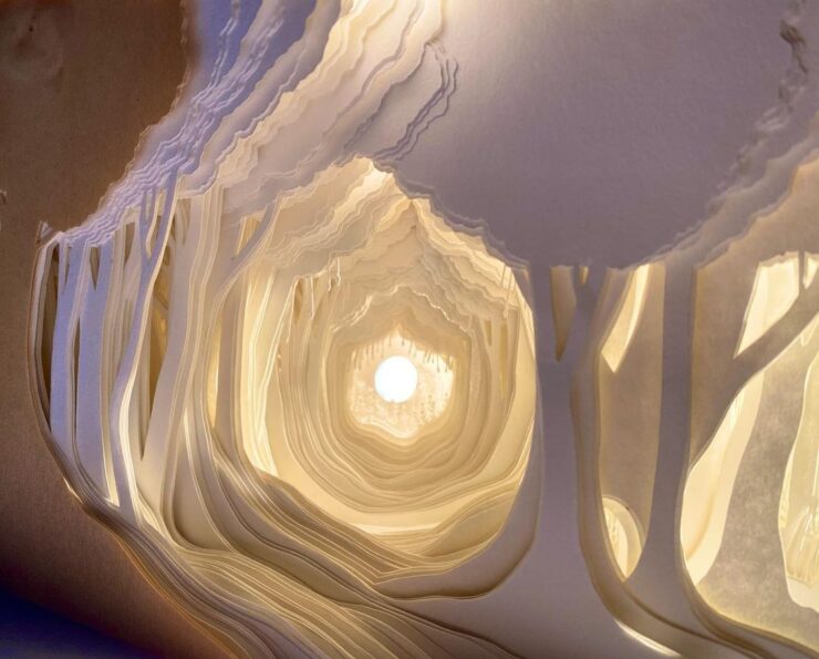 Non a caso, l’artista ricorre al termine “Kami” per descrivere e motivare il suo lavoro, e i “Kami”, ossia le “essenze spirituali”, sono le forze della natura in toto. Secondo la religione shintoista, qualsiasi entità, vivente o non vivente, è espressione di un “Kami”, anzi, è essa stessa un “Kami” in quanto in rapporto di coessenzialità reciproca. Insomma, i “Kami” rappresentano l’infinita frammentazione di un’unica energia cosmica che compone tutte le cose. Paper compresa. Sostiene Ayumi Shibata: “taglio la carta per esprimere la mia gratitudine agli spiriti ‘Kami’. Ogni taglio, ogni pagina è un’orazione. Il mio processo mi aiuta a liberare la mente durante la meditazione o la preghiera. Purifico la mia anima attraverso l’atto del tagliare: così interagendo, posso connettere il mondo spirituale con il nostro”.