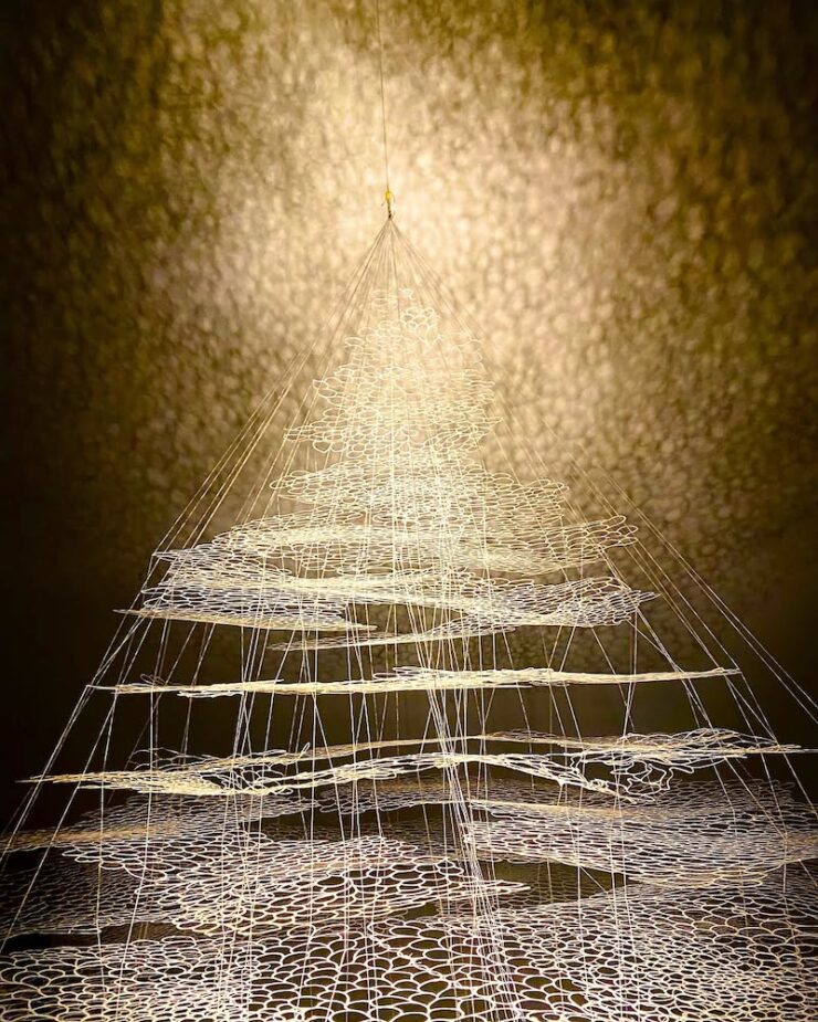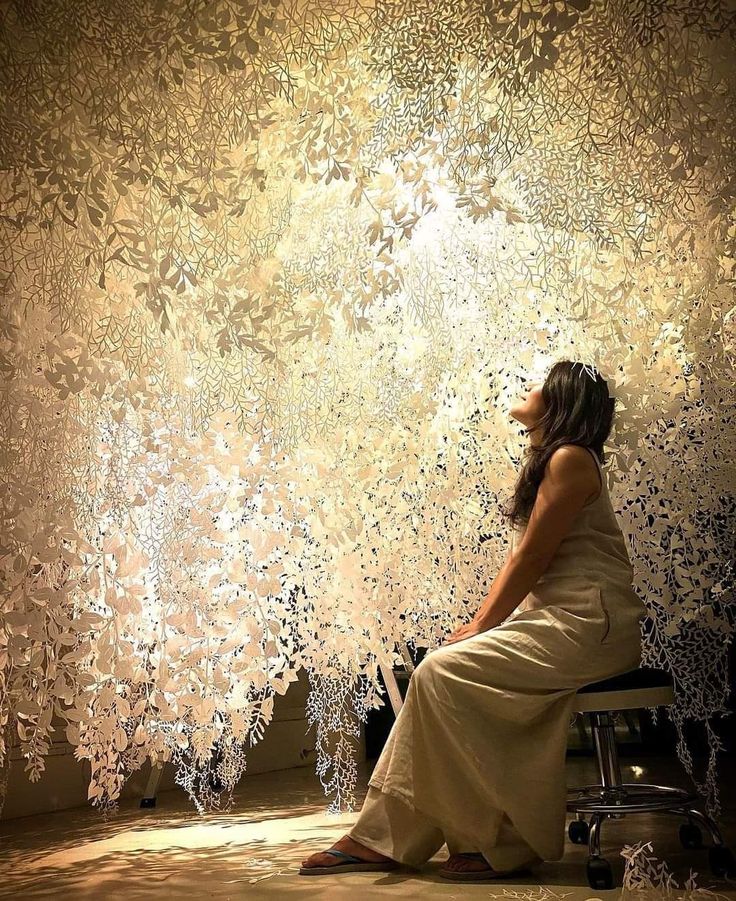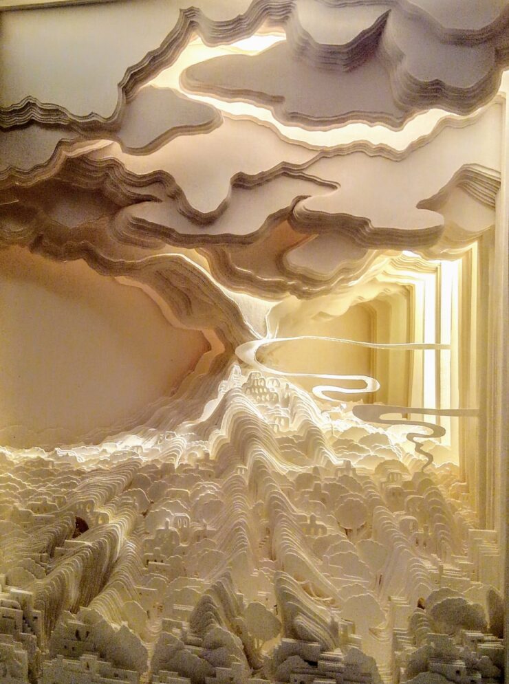 Le sue abili forbici recidono e intagliano i fogli, rigorosamente bianchi, che si configurano via via a guisa di reti, o ragnatele, o ricami, o radiografie di elementi, alberi, paesaggi immaginari, città ideali, ondulazioni, increspature, vortici soavi, impronte e fluttuazioni… un artigianato albino su cui luci – strategicamente posizionate – e ombre ne amplificano ritmi e intensità. Una specie di fase delle fasi capace di associare e far lievitare il sogno… quello di un mondo in cui gli esseri umani e la natura convivano pacificamente. Non a caso, le sue sculture si richiamano anche ai concetti dello Yin e Yang, le due potenze inverse e complementari che si integrano e si completano vicendevolmente, determinando l’armonia dell’universo. Lo Yin è abbinato a ciò che è passivo, indifferente, vacuo, mentre lo Yang è abbinato a ciò che è attivo, vivido, pervaso.