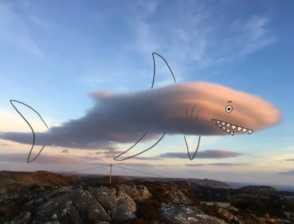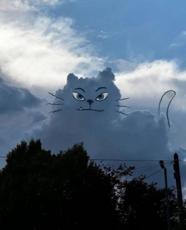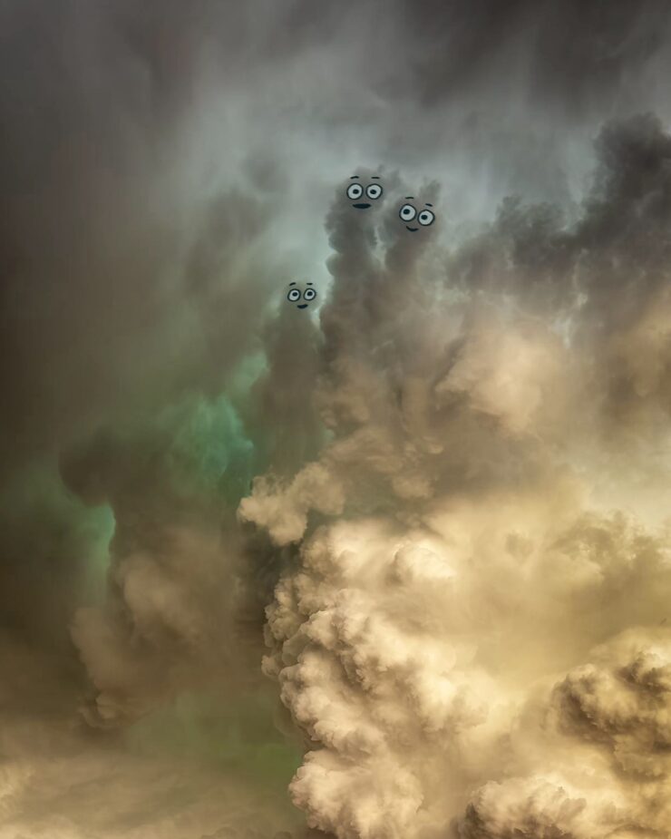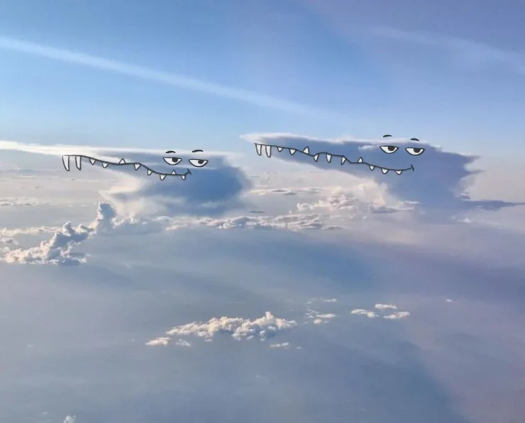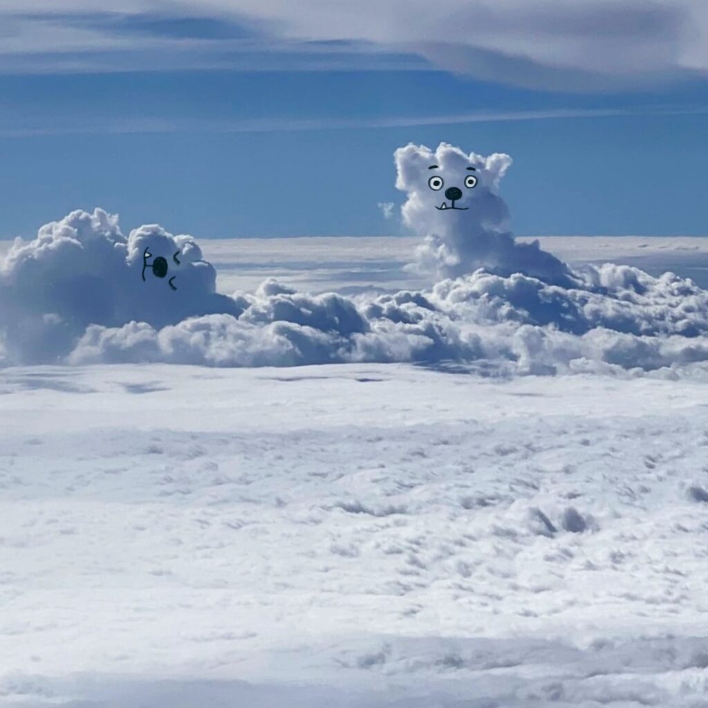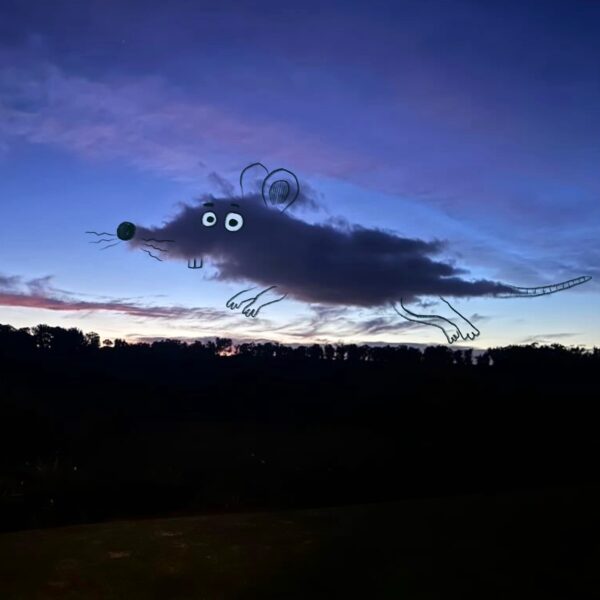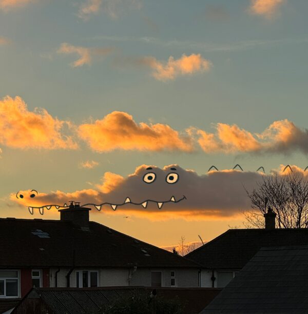 Nell’estate del 2020, durante le misure di confinamento per la pandemia di Covid-19, Chris, tra un’illustrazione e l’altra, una storia per l’infanzia e l’altra, si tratteneva parecchie ore in giardino in compagnia dei figlioletti e della moglie Cliona O’Flahertyalla, fotografa di professione. In tanta pace forzata ma intrisa d’inaspettata intimità familiare, la volta celeste e la sua osservazione di giorno e di notte, divennero complici di un’avventura singolare: con scrupolosa e gioiosa frequenza, egli iniziò a sfogliare con sguardo pensante l’immenso album di Cirri, Nembi, Strati… l’intero repertorio delle nubi insomma, rintracciando in ognuna nuova vita e nuove logiche che, per qualche segreto, abitano l’altrove. Da lì, l’idea di fotografarle e di intervenire graficamente sulle foto stesse per caratterizzare ciò che lui già aveva ravvisato: creature degli abissi e creature dell’aria, mostri benevoli, ciclopici faccioni, spettri gioviali che anziché incutere timore invitano al sorriso, e soprattutto simpatici animali, dai più domestici ai più selvatici.
