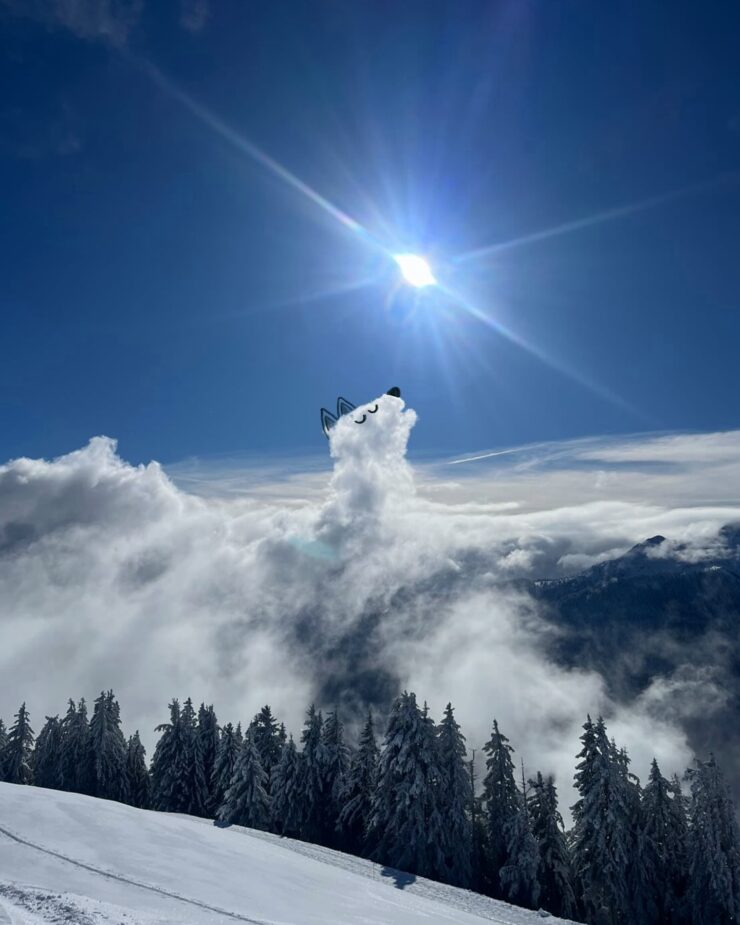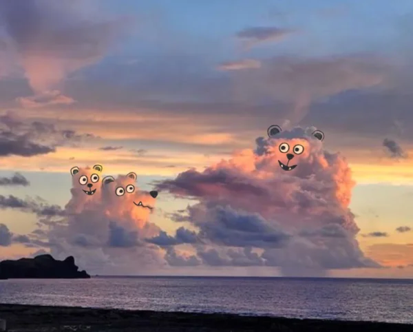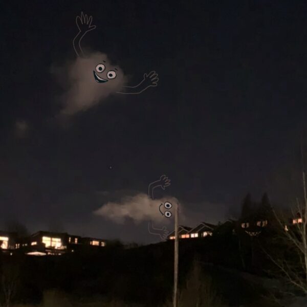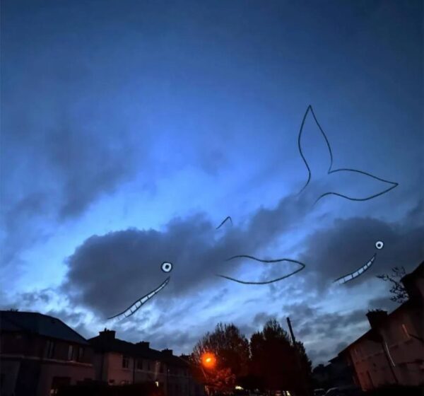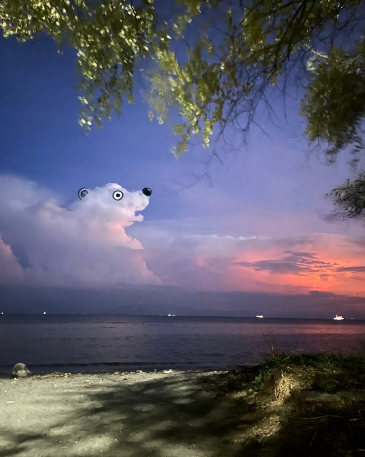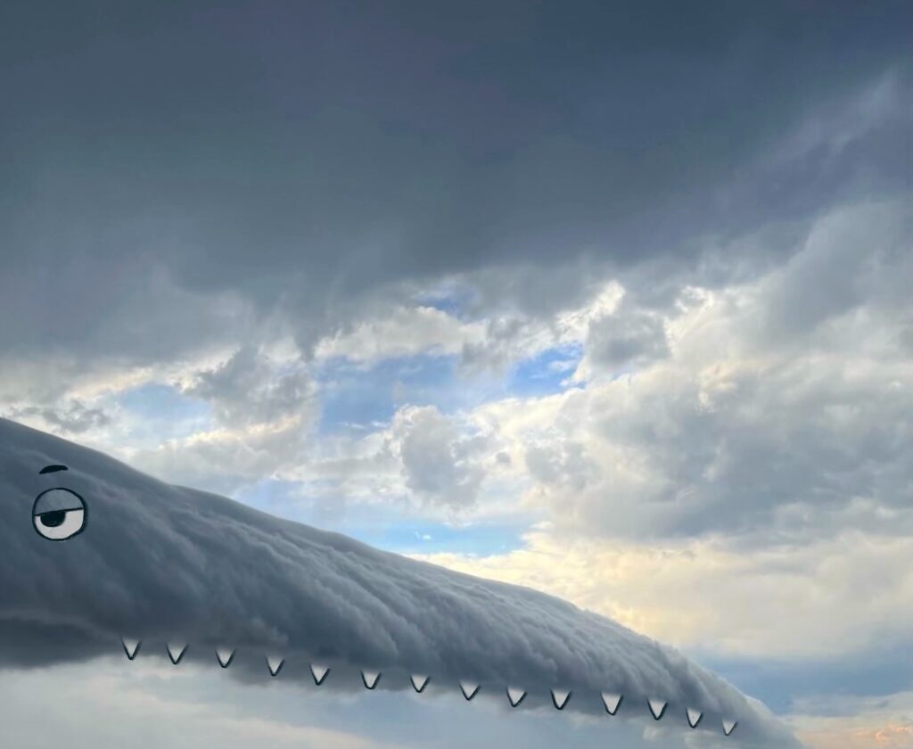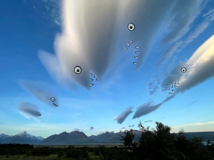 Nell’estate del 2020, durante le misure di confinamento per la pandemia di Covid-19, Chris, tra un’illustrazione e l’altra, una storia per l’infanzia e l’altra, si tratteneva parecchie ore in giardino in compagnia dei figlioletti e della moglie Cliona O’Flahertyalla, fotografa di professione. In tanta pace forzata ma intrisa d’inaspettata intimità familiare, la volta celeste e la sua osservazione di giorno e di notte, divennero complici di un’avventura singolare: con scrupolosa e gioiosa frequenza, egli iniziò a sfogliare con sguardo pensante l’immenso album di Cirri, Nembi, Strati… l’intero repertorio delle nubi insomma, rintracciando in ognuna nuova vita e nuove logiche che, per qualche segreto, abitano l’altrove. Da lì, l’idea di fotografarle e di intervenire graficamente sulle foto stesse per caratterizzare ciò che lui già aveva ravvisato: creature degli abissi e creature dell’aria, mostri benevoli, ciclopici faccioni, spettri gioviali che anziché incutere timore invitano al sorriso, e soprattutto simpatici animali, dai più domestici ai più selvatici.