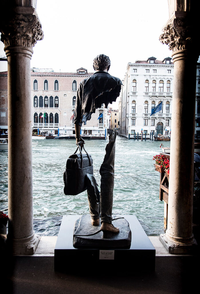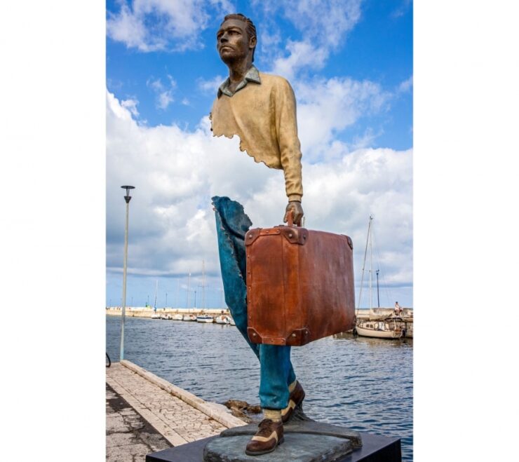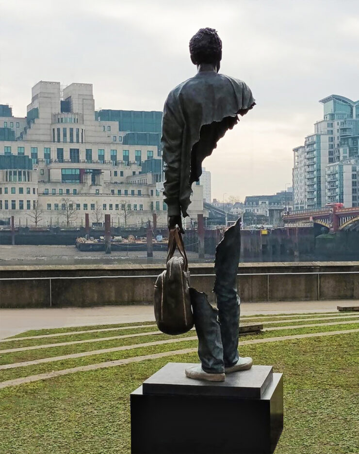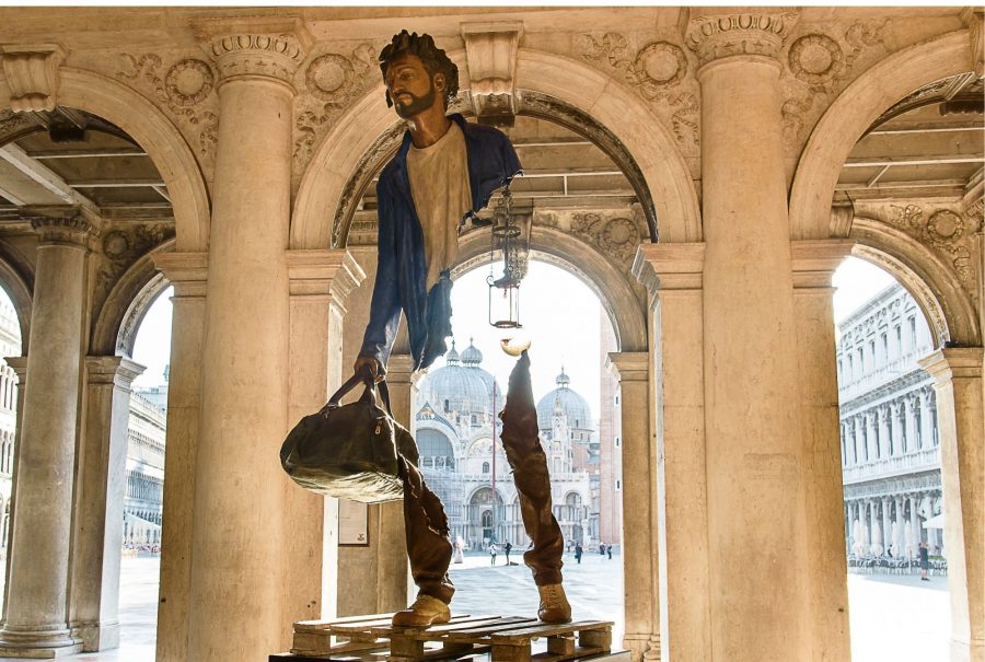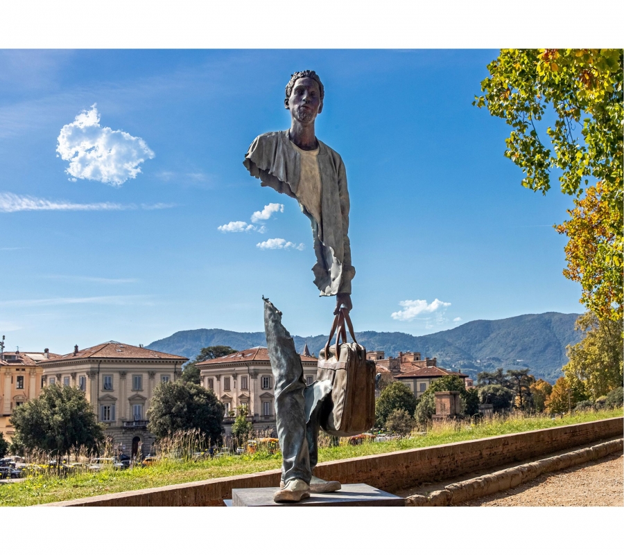 Figure vulnerabili e potenti ormai disseminate per il globo, figure incomplete, slabbrate, scavate, corrose. Il busto galleggia sopra le gambe. Due brani di fisicità in un’ipotesi di intero: è la valigia il trait d’union, l’innesto tra la porzione pensante e la porzione viandante. Valigia (o borsone, o sacca, o fagotto, comunque unica risorsa) che custodisce tutto, radici e prospettive, centri di forza. “È come se il corpo si svuotasse per fare spazio alla storia che trasporta. E quella storia è sempre più grande del corpo stesso”. |