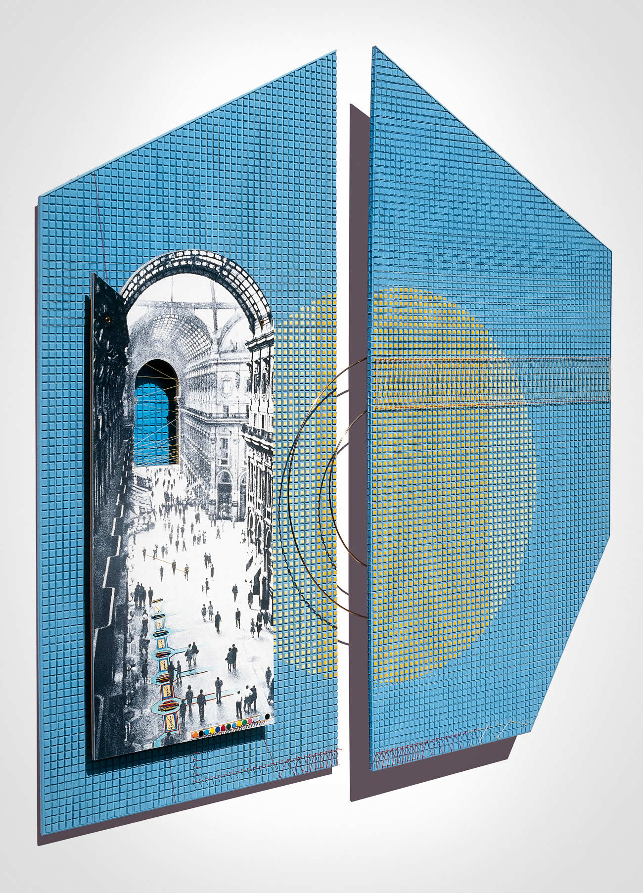 legno verniciato, linoleum, acrilici, spilli, ottone, fili di cotone.